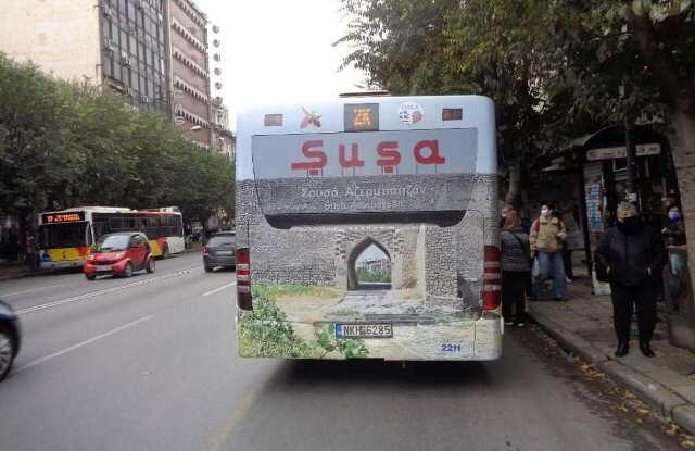 Yunanıstanın 2-ci böyük şəhəri Salonikidə avtobus dayanacağında Şuşa şəhərinin fotosu olan plakat yerləşdirilib.