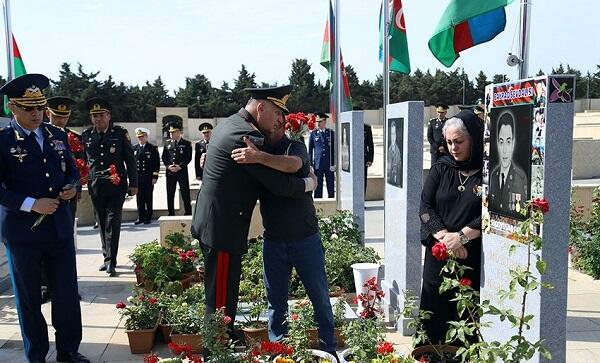Sonra Müdafiə Nazirliyinin rəhbərliyi İkinci Şəhidlər xiyabanına gələrək ölkəmizin suverenliyi və ərazi bütövlüyü uğrunda gedən döyüşlərdə canlarından keçmiş şəhidlərimizin məzarlarını ziyarət edərək üzərinə gül dəstələri qoyub.