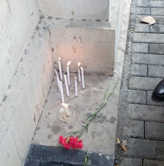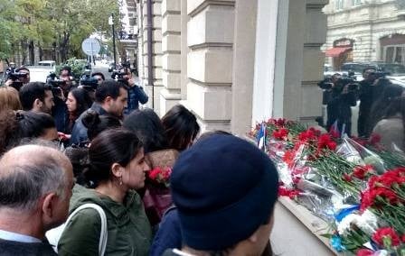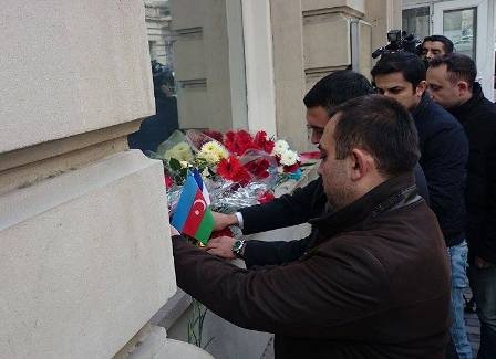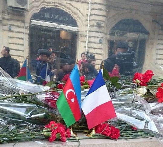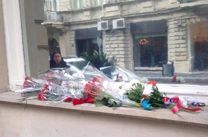 "13 noyabr 2015-ci il tarixində Parisdə baş vermiş terror qurbanlarının xatirəsinə insanlar Fransanın Azərbaycandakı səfirliyinin qarşısına gül dəstələri qoyurlar".