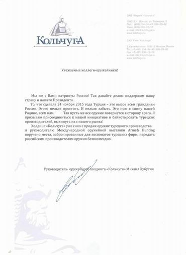 Şirkət Rusiyanın vurulan Su-24 təyyarəsinə görə, Türkiyədə istehsal edilən silahları da boykot edəcəyini açıqlayıb.