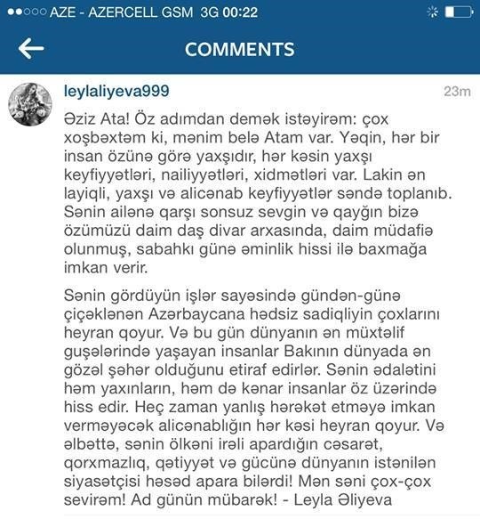 "Əziz Ata! Öz adımdan demək istəyirəm: Çox xoşbəxtəm ki, mənim