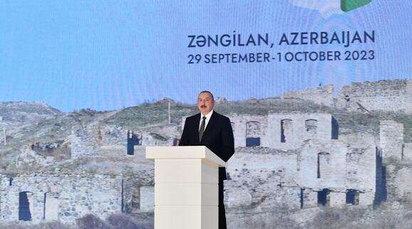 Hesab edirəm ki, bu gün burada - Zəngilanda, növbəti günlərdə Forumun Bakıda davam etdiyi müddətdə müzakirələr təkcə şəhər planlaması və inkişafa dair təcrübə mübadiləsi ilə bağlı olmayacaq, regionun gələcəyi barədə də fikir mübadiləsi aparılacaq. Biz bu regionun gələcəyini necə görürük? Diqqətinizə çatdırmaq istəyirəm ki, bizə qarşı 30 il ərzində etnik təmizləmə, işğal və ərazilərimizin məhvi həyata keçirilib, bir milyondan çox azərbaycanlı evlərindən didərgin salınıb. Onların 200 mindən çoxu hazırkı Ermənistan ərazisindən deportasiya olunub. Bizim şəhərlərimiz, kəndlərimiz darmadağın edilib. Otuz il ərzində işğalçı qüvvələr bizə buraya qayıtmağa imkan vermirdi və beynəlxalq ictimaiyyətin münaqişənin dinc yolla həllinə dair bütün səylərini bloklayırdılar. Təsəvvür edirsinizmi, 1992-ci ildən 2020-ci ilə qədər danışıqlar aparıldı. Sonsuz, mənasız danışıqlar aparılırdı və onların nəticəsi sıfır idi. Danışıqlara vasitəçilik edən ölkələrə baxsaq, görərik ki, onlar istəsəydilər, buna çoxdan nail olmuşdular. Baxın, BMT Təhlükəsizlik Şurasının üç daimi üzvü, üç nüvə ölkəsi - onlar keçmiş Minsk qrupunun həmsədrləri idi. O qrup ki, işğala son qoymaq üçün mandatı var idi və bu, ATƏT-in çətiri altında həyata keçirilirdi. Amma bizim üçün digər hüquqi çərçivə də var idi. BMT Təhlükəsizlik Şurasının 4 qətnaməsi var idi ki, onlar bizim ərazilərimizin işğaldan qeyd-şərtsiz və tam azad olunmasını tələb edirdi. Onlar 1993-cü ildə qəbul edilmişdi. Onlar kağız üzərində qalmışdı. Çünki siyasi iradə yox idi və məlum idi ki, Ermənistan bunu istəmir. Onlar status-kvonu əbədi saxlamaq istəyirdilər. Onlar bizim torpaqlarımızı daim öz nəzarətində saxlamaq istəyirdilər. Onlar bu yerlərdə, o cümlədən burada - Zəngilanda qanunsuz məskunlaşma aparırdılar. Ola bilər ki, bu, Zəngilanda o qədər də geniş vüsət almamışdı, amma Laçında, Kəlbəcərdə, Şuşada minlərlə qeyri-qanuni sakin məskunlaşdırılmışdı. Onlar Yaxın Şərqdən və digər ölkələrdən, diaspor tərəfindən dəvət edilmişdilər.