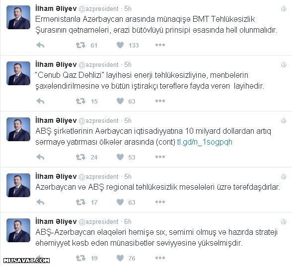 Prezident İlham Əliyevə məxsus Tvitter hesabından (@azpresident) ABŞ-Azərbaycan münasibətlərinə dair qısa mesajlar paylaşılıb.