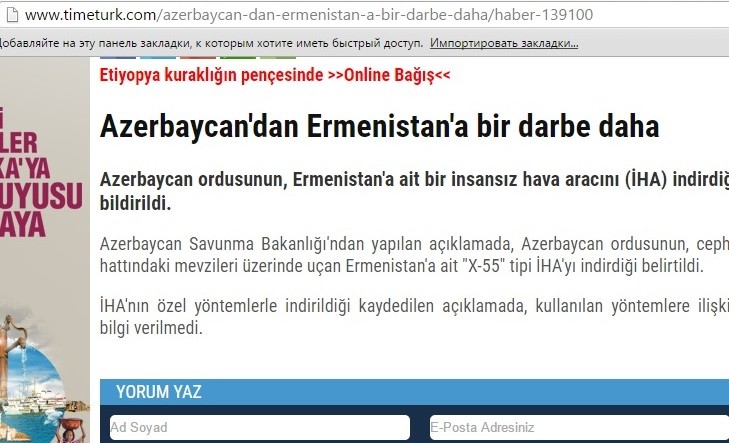 Axar.az xəbər verir ki, Türkiyənin "Taymtürk" xəbər portalı Azərbaycan Müdafiə Nazirliyinin yaydığı məlumata əsaslanaraq cəbhə bölgəsində Azərbaycan ordusunun Ermənistana aid PUA-nı ələ keçirdiyini yazıb.