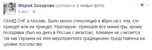 Axar.az xəbər verir ki, bunu öz Feysbuk səhifəsində Rusiya Xarici İşlər Nazirliyinin rəsmi nümayəndəsi Mariya Zaxarova yayıb. O, görüşdə yalnız Moldova xarici işlər nazirinin iştirak etmədiyini bildirib. Ukraynanı isə burada ənənəvi olaraq, nazir yerinə Moskvadakı səfiri təmsil edib.