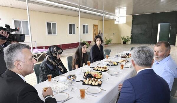Sonra Mübariz İbrahimovun ailəsinin yaşadığı evə gələn Leyla Əliyeva Azərbaycanın Milli Qəhrəmanının atası və anası ilə çay süfrəsi arxasında söhbət edib.