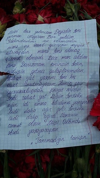 Aprelin 4-də Tərtər istiqamətində gedən döyüşlərdə şəhid olan Müşfiq Orucovun naməlum sevgilisi onun məzarı üstünə məktub qoyub.