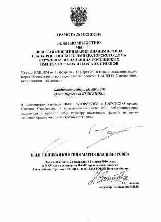 Erməni tarixi ilə bağlı saxtakarlıqları ifşa edən, erməni mifi haqqında çoxlu sayda araşdırmaların müəllifi olan rusiyalı tarixçi alim Oleq Kuznetsova Müqəddəs Stanislav İmperator və Çar ordeninin 3-cü dərəcəsi medalı ilə təltif edilib.
