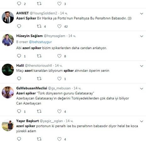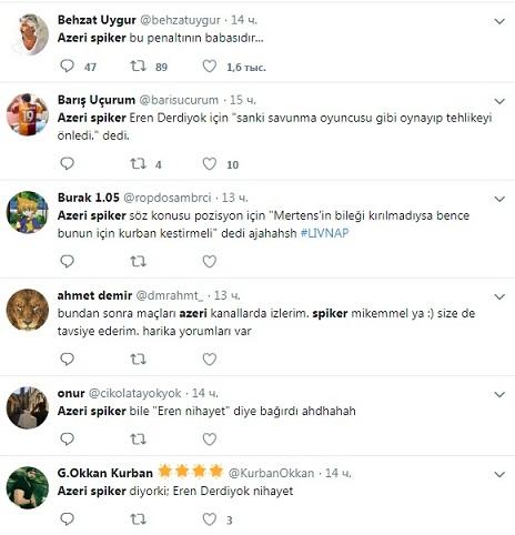 Kult.az xəbər verir ki, türkiyəli azarkeşlər “azərispiker” həştəqi ilə Gündüz Abbaszadənin matçı şərh etməsini çox bəyəndiklərini bildiriblər. Hətta Türkiyənin tanınmış aktyoru Behzad Uyqur da Gündüz Abbaszadənin şərhini qiymətləndirib.