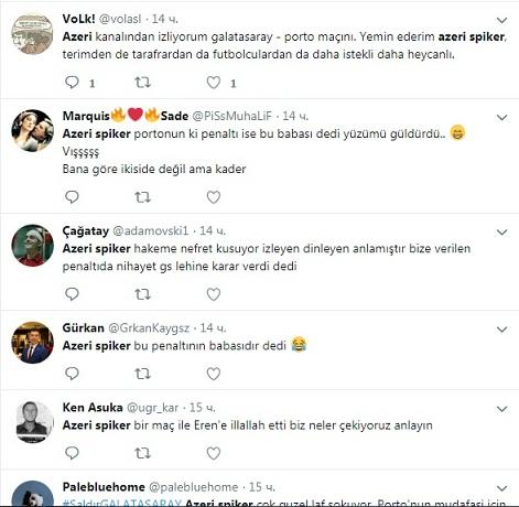 Çempionlar Liqasının D qrupunda baş tutan “Qalatasaray” - “Porto” matçını CBC Sport kanalından izləyən türklər şərhçi Gündüz Abbaszadəni Tvitterdə fenomenə çeviriblər.