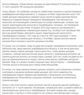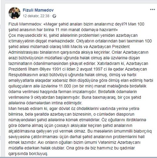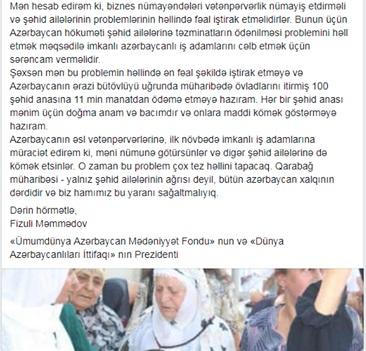 Hətta iş o yerə çatır ki, xeyriyyəçi kimi tanıdığımız və qazilərə münasibətinə görə media dəstəyini daim göstərdiyimiz Füzuli Məmmədov da (skrinlər əlavə edilir) dövlətlə bir zamanlar adını daşıdığı Frenk Elkaponi kimi danışmağı özünə rəva görür, “hakimiyyətin öz öhdəliyini yerinə yetirməməsi” düşüncəsizliyini göstərir.