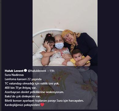 Haluk Levent sosial mediada xərçəng xəstəliyindən əziyyət çəkən 22 yaşlı Sura Nadirovaya kömək məqsədilə kampaniya başladıb: