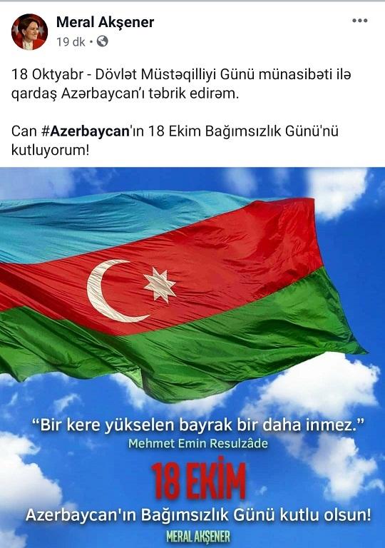 İYİ Partiyanın başqanı Maral Akşənər Azərbaycanın Müstəqillik gününü təbrik edib.