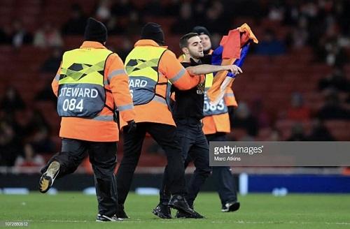 O, əlində separatçı "Dağlıq Qarabağ" rejiminin bayrağını tutaraq, "Qarabağ" futbolçularının üzərinə qaçıb. Azərbaycan təmsilçisinin oyunçuları və stüardlar təxribata cəhd edən fanatı dərhal zərərsizləşdirərək, meydandan kənarlaşdırıblar.