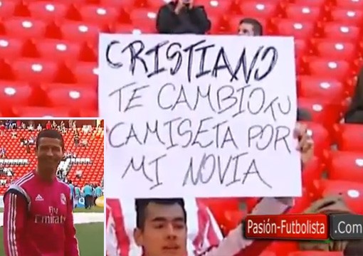 Marselonun Ronaldoya işarə ilə göstərdiyi plakatda ispanca "Cristiano, te cambio tu camisita pormu novia" - yəni, "Kriştiano, formanı ver, sevgilimi verim", - yazılıb.