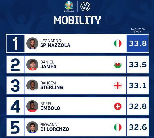 5 ən sürətli futbolçu siyahısına İsveçrə yığmasından Bril Embolo (32,8 km/saat) və İtaliyanın daha bir təmsilçisi Covanni Di Lorentso (32,6 km/saat) da düşüb.