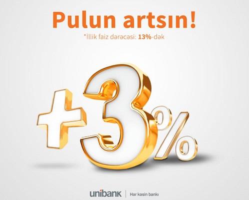Hər kəs öz pulunu banka daha yüksək faizlə yerləşdirsin deyə, “Unibank” depozit kampaniyasının müddətini daha iki ay uzatdı. Kampaniya müddətində qoyulan depozitlərlərə, “Unibank” əlavə 3% hədiyyə edir. Martın sonunadək davam edən kampaniyada öz manat vəsaitlərinizi çox yüksək faizlə banka etibar edə bilərsiniz. Aksiya çərçivəsində “Müddətli” depozitin faiz dərəcəsi müddətin sonuna 13%-ə, “Yığım” depozitinin faiz dərəcəsi isə illik 11%-ə yüksəlib.
