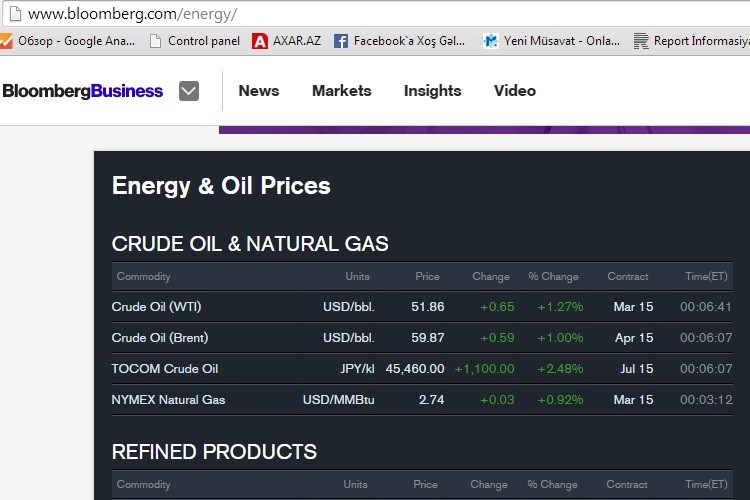Axar.az "Bloomberg" agentliyinə istinadən xəbər verir ki, dünya bazarında VTI (West Texas Intermediate) markalı xam neftin bir barrelinin qiyməti 1,27% yaxud 0,65 dollar artaraq 51,86 dollar olub.