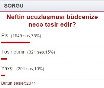 2071 nəfərin iştirak etdiyi sorğuda iştirakçılara "Neftin ucuzlaşması büdcənizə necə təsir edir?" sualı ilə müraciət edilib. Respondentlərin 75%-i neftin ucuzlaşmasının təsirlərini öz büdcəsində hiss etdiyini bildirib. İştirakçıların 15%-i isə neft qiyməti böhranından heç bir təsirə məruz qalmadığını yazıb. Yerdə qalan səs faizinin sahibləri isə bu təsirin yaxşı olduğunu söyləyiblər.