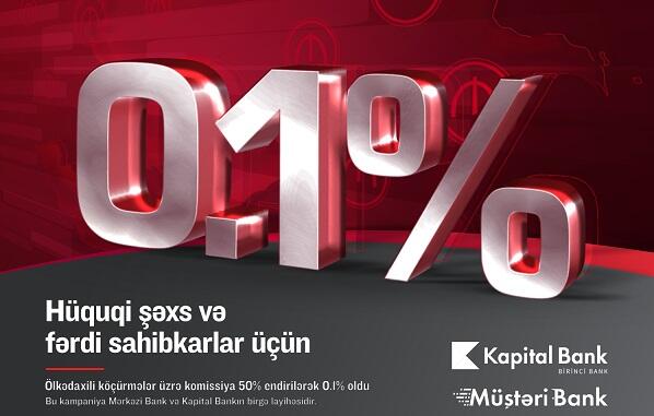 Kapital Bank Azərbaycan Respublikası Mərkəzi Bankının çağırışına qoşularaq, pandemiya dövründə hüquqi şəxslərə və sahibkarlara növbəti dəstək aksiyasını təqdim edir. Belə ki, 30 sentyabr 2020-ci il tarixinədək hüquqi şəxs və fərdi sahibkarlara respublikadaxili köçürmə komissiyası 50% endirilərək 0,1% təyin edilib.