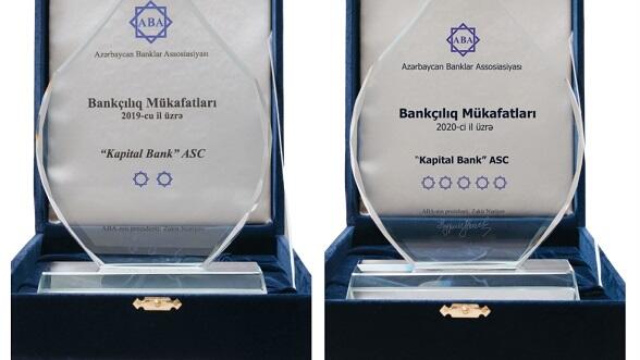 Axar.az xəbər verir ki, Kapital Bank 2019-cu il üzrə “Korporativ sosial məsuliyyət” və “Ən fəal təhsil dəstəkçisi”, 2020-ci il üzrə isə “Korporativ sosial məsuliyyət”, “Ən fəal maliyyə savadlığı dəstəkçisi”, “Ən fəal təhsil dəstəkçisi”, “Nağdsız ödənişlərin təşviqi sahəsində tədbirlərlə fərqlənən ABA üzvü” və “Elektron Bankçılıq” nominasiyalarının qalibi olub.
