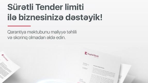 Kapital Bank hüquqi şəxslərə və sahibkarlıq fəaliyyəti ilə məşğul olanlara ölkədə həyata keçirilən layihələrdə iştirak etmək üçün “Sürətli tender” məhsulunu təklif edir. Artıq bu məhsul üzrə banka müraciət edənlərə maksimal olaraq 100 000 AZN-dək limit təklif olunur.
