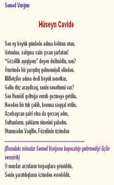 fotonu göndərib. Şəkildə Səməd Vurğunun Hüseyn Cavidə yazdığı