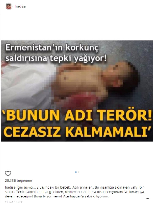 "İçim ağrıyır. 2 yaşlı bir uşaq, dərdli analar. Bu, insanlığa sığmayan vəhşi bir hücumdur! Terror hücumlarını hansı dildən, dindən, irqdən olursa-olsun, pisləyirəm! Və pisləməyə davam edəcəyəm! Buna bir son verin! Azərbaycana səbir diləyirəm", - Hadisə İnstaqram hesabında yazıb.