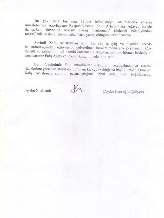 Aydın Xırdalanlının ondan rəsmən üzr istədiyini əks etdirən sənəd