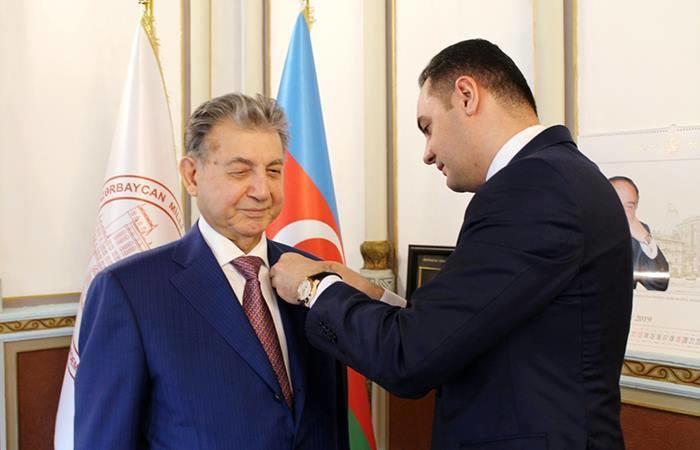 Döş nişanını AMEA prezidentinə ANİİA-nın sədri Fərhad Qaraşov təqdim edib.