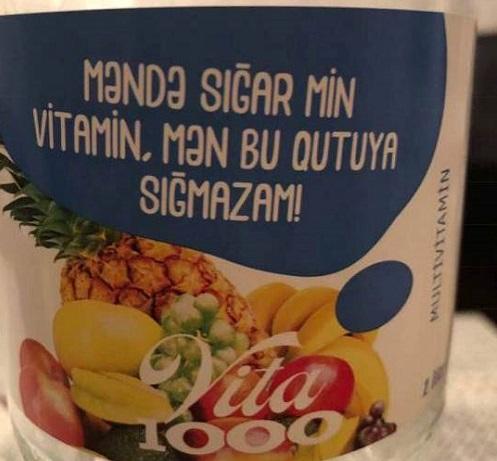 “Vita 1000” meyvə şirələrinin qablaşdırıldığı qutuların üzərində “Məndə sığar min vitamin, mən bu qutuya sığmazam” formasında yazılması məşhur kəlamın mənasının və təyinatının dəyişdirilməsi yolu ilə təhrif edilməsinə səbəb olub və bununla da müəllifin şərəf və ləyaqətinə xələl gətirilib.