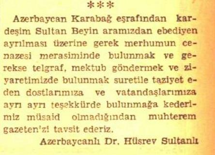"Azərbaycanın Qarabağın tanınmış şəxsiyyətlərindən olan qardaşım Sultan Bəy aramızdan əbədiyyən ayrıldığı üçün mərhumun cənazəsi mərasimində iştirak edərək, teleqraf, məktub göndərərək və ziyarət edərək başsağlığı verən dostlarımıza və vətəndaşlarımıza ayrı-ayrılıqda təşəkkür etməyə kədərimiz səbəbilə vaxt tapmadığımız üçün möhtərəm qəzetinizi məsləhət görürük".