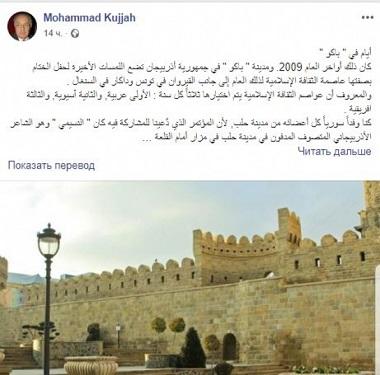 Suriyanın məşhur “Əl-Adiyyat” jurnalının baş redaktoru Məhəmməd Qoca Feysbuk sosial şəbəkəsindəki səhifəsində Azərbaycan Respublikasında “Nəsimi ili” münasibətilə öz Bakı xatirələrini bölüşüb.