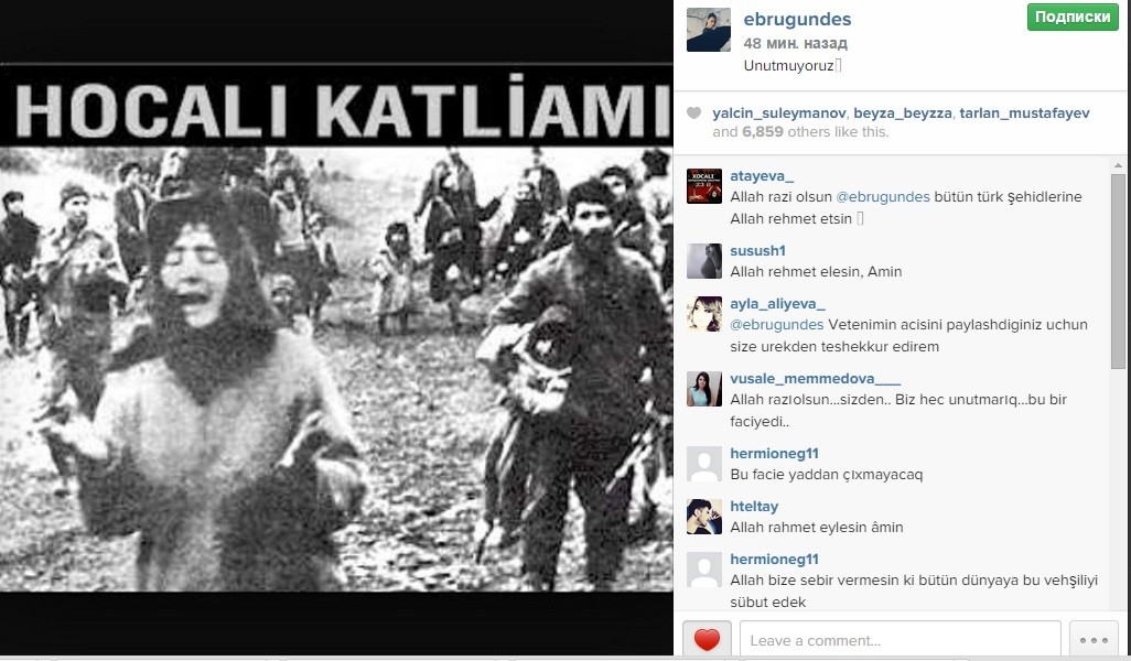 Azərbaycanlı iş adamı Rza Zarrabla ailəli olan tanınmış türkiyəli müğənni Ebru Gündeş Xocalı soyqırımından yazıb.