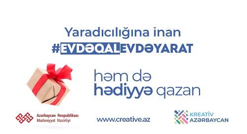 Koronavirus infeksiyasının yayıldığı müddətdə evdə olaraq yaratdığınız işi (əl işi, rəsm əsəri, musiqi əsəri, dizayn, video, yazılı mətn, foto, yaradıcı texnologiya və s.) öz səhifənizdə #evdəqalevdəyarat həştəqi ilə paylaşın,