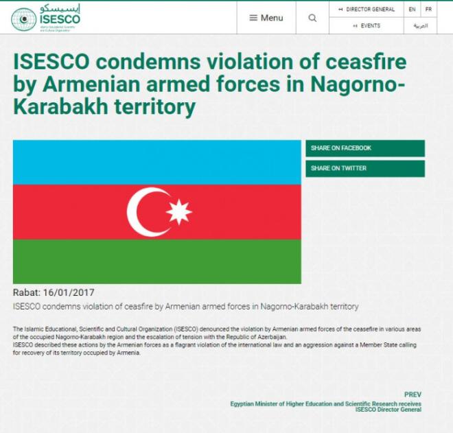 İslam Dünyası Təhsil, Elm və Mədəniyyət Təşkilatı (İSESKO) Ermənistan və Azərbaycan arasındakı son hadisələrdən, eləcə də arxeoloji, tarixi məkanların, bir neçə məscidin və müqəddəs yerlərin dağıdılmasına hədəflənən addımlardan narahatlığını bildirir.