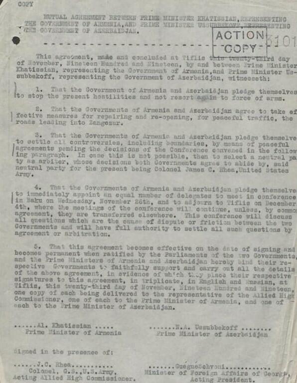 Azərbaycanın birinci hökumətində hərbi nazir olmuş Xosrov bəy Sultanov Qarabağ general-qubernatoru təyin edildi. Ermənilərin narahat olduğunu görən, Zəngəzurun Azərbaycan Cümhuriyyəti tərkibində qalmasına qarşı çıxan Amerika dərhal üçtərəfli görüş keçirilib, “sülh sazişi”nin imzalanması tapşırığını Ceyms Reyə verir. Bu tapşırıq gələnə qədər Azərbaycan Cümhuriyyətinin ordusu Zəngəzuru ermənilərdən tamam təmizləmək üzrə idi. Xosrov bəy Sultanov, Sultan bəy Sultanovun başçılığı ilə ordu erməniləri geri qovmaqda davam edirdi. Müharibədə ermənilərin geri çəkilməsi, məğlub olması Amerikanı çox narahat edirdi. Buna görə də amerikalı polkovnikin inadı və məkrli planı ilə ikitərəfli sazişi imzalamaqla Ermənistan və Azərbaycan hökumətləri razılığa gəlmişdilər ki, bundan sonra silaha əl atmayacaqlar, hər iki hökumət Zəngəzura gedən yolların açılması üçün tədbirlər görəcək, sərhəd məsələləri də daxil olmaqla, bütün mübahisəli problemlər sülh konfransının qərarına qədər yalnız sülh yolu ilə həll ediləcək, barışıq əldə edilmədikdə polkovnik Ceyms Rey münsiflər məhkəməsi sifətində tədbirlər görəcək, danışıqlar aparmaq üçün iki ölkə bərabər sayda nümayəndələr seçəcək və mübahisəli məsələlər müzakirə ediləcək, tərəflər bu sazişin müddəalarına vicdanla əməl edəcəklər.
