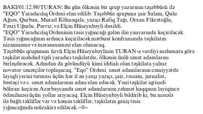 mövcud olmuş "Eqo" yaradıcılıq ordeni ilə bağlı keçirdiyi sorğu