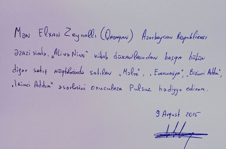 "Mən Elxan Zeynallı (Qaraqan) Azərbaycan ərazisində "Ali və Nino" kitab dükanlarından başqa bütün digər satış nöqtələrində satılan "Mələk", "Evakuasiya", "Birinci addım", "İkinci addım" əsərlərini oxuculara pulsuz hədiyyə edirəm".