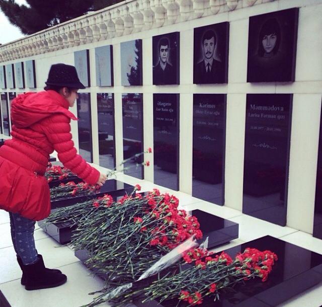 "Bu gün qızımla Şəhidlər Xiyabanını ziyarət etdim. Allah Rəhmət etsin. Qızım 4 ildir, şəhid Larisanın oxuduğu məktəbdə təhsil alır. Onunla qürur duyur, onun məzarını ziyarət etmək arzusuna çatdı" ("Axşam.az").