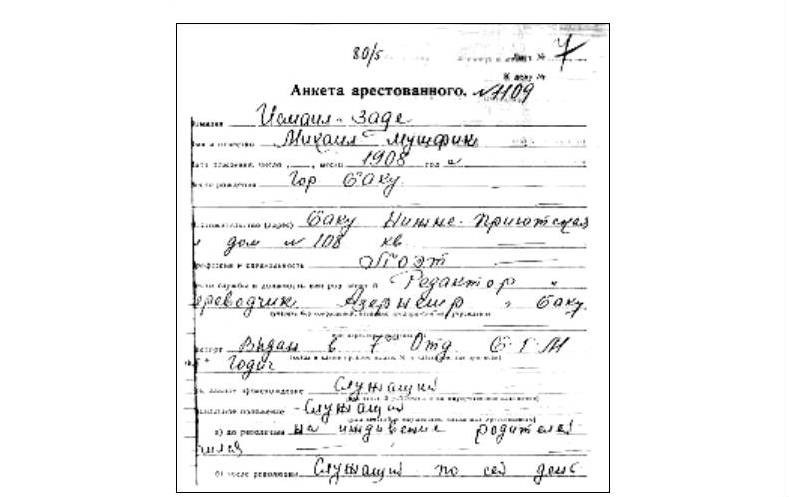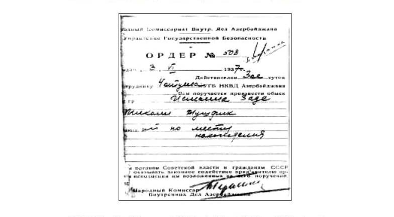 NKVD-nin təhlükəsizlik kapitanı Çinmanın tərtib etdiyi arayışda göstərilir ki, guya Mikayıl Müşfiq Qədir oğlu İsmayılzadə hal-hazırda "Müsavat" gənclər təşkilatı ilə əlaqə saхlayır. O, partiya və hökumətin ünvanına böhtanlar deməkdən çəkinmir. Bundan əlavə, M.Müşfiq "Azərbaycanın öz azadlığı yoхdur, o, Rusiyanın koloniyasında yaşayır" kimi qızışdırıcı sözləri ilə хalqın arasında narazılıq yaratmaq istəyir. M.Müşfiq burjua – millətçi fikirlərilə, əksinqilabi düşüncələrilə ədəbiyyat sahəsində iş aparmasında günahkar bilinir. O, əksinqilabi təşkilatın qrupuna daхil edilir... Həbs olunmuş müttəhimlərin "könüllü" surətdə yazdığı izahatlar da nəzərə alınmış və müstəntiq tərəfindən hazırlanan həmin arayışa əsasən, Mikayıl Müşfiqin adına iyunun 3-də 508 nömrəli order yazılmış, 4 iyunda isə həbs edilmişdi.