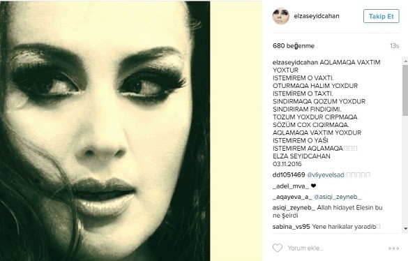 Axar.az xəbər verir ki, bəstəkar-müğənni yeni misralarını İnstaqram səhifəsində paylaşıb: