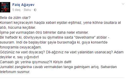 “Belə də zülm olar? Konsert keçirəcəyim haqda xəbəri eşidər-eşitməz yenə köhnə üsullara əl atıb, hücuma keçiblər. İşimə pəl vurmaqdan ötrü bilmirlər daha nələr etsinlər. Bir həftədir ki, dövriyyəyə su qiymətinə saxta dəvətnamə atıblar - susuram. Gözünüz nə vaxt doyacaq? Dil-ağzınız nə vaxt yalandan usanacaq? Adam deyillər e, səy yığınıdır! Camaatı gic yerinə qoymusuz?! Kiriyin də! Jurnalist zənglərinə cavab verməkdən təngə gəlmişəm artıq. Səhərdən telefonum susmur”.