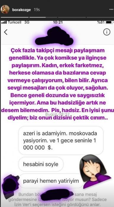 Qeyd edək ki, türkiyəli aktrisa Özgə Borak sosial şəbəkə hesabında özünü azərbaycanlı iş adamı kimi təqdim edən şəxsin ona 1 milyon dollarlıq əxlaqsız təklif etdiyini yazıb: