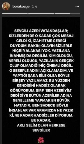 “Hörmətli Azərbaycan vətəndaşları, sizlərdən o qədər çox mesaj gəldi ki, izahat verməyə ehtiyac duydum. Hadisənin sizinlə heç bir əlaqəsi yoxdur. Yazılana da inanmamışam. Kim olduğunun, hardan olduğunun, yazılanın nə dərəcədə həqiqi olmasının da heç bir önəmi yoxdur. Bu səbəbdən də adını açıqlamadım. Etdiyi zarafat belə olsa, yazılması doğru deyil. Buna görə də həmin şəxsi “həddini bilməz” adlandırıram. Bu məsələni bütün azərbaycanlıların adına ümumiləşdirmək ən böyük xətadır. Mən, sadəcə, aramızda belə insanların olmasına təəssüflənirəm”.