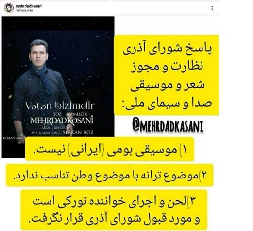 İran Teleradiosunun Şeir və Musiqiyə Nəzarət və Lisenziya Şurası azərbaycanlı müğənni Mehrdad Kəsaninin “Vətən bizimdir” mahnısına icazə verməyib.