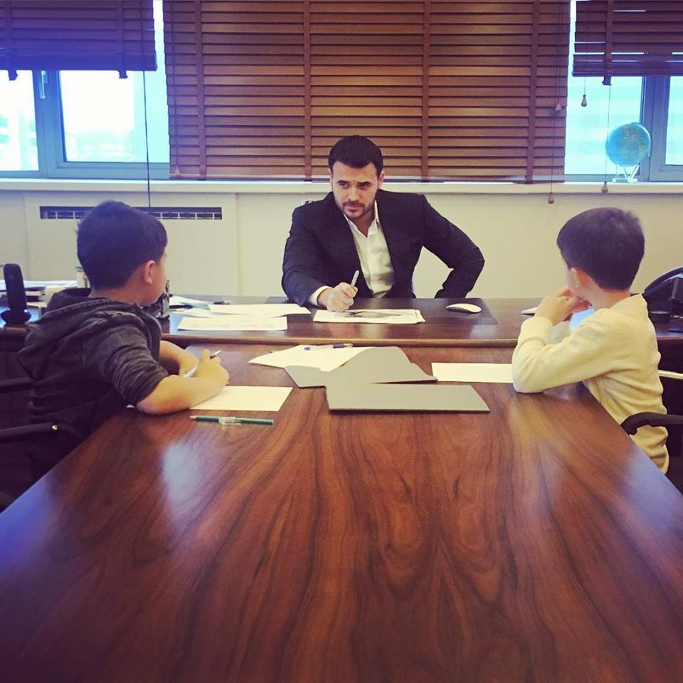 Axar.az xəbər verir ki, ofisdə çəkilmiş fotoda Eminin başda oturub nəsə danışdığı, övladlarının da qarşılarında qələm-kağızla onu diqqətlə dinlədiyi görünür.