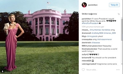 Axar.az xəbər verir ki, aktrisa sosial şəbəkədə budəfəki prezident seçkilərində özünü namizəd kimi qeyd edib. O, çəhrayı rəngə "boyadığı" Ağ Evlə fotoşopunu paylaşaraq bunları yazıb: