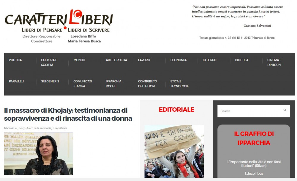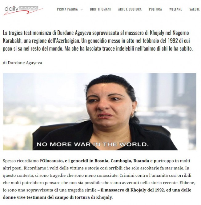 İtaliyanın “Deyli Kases” və “Caratteri Liberi” informasiya portallarında Xocalı soyqırımının şahidi Dürdanə Ağayevanın “Xocalı qətliamı: bir qadının sağ qalması və yenidən doğulması hekayəsi” sərlövhəli məqaləsi yayılıb.