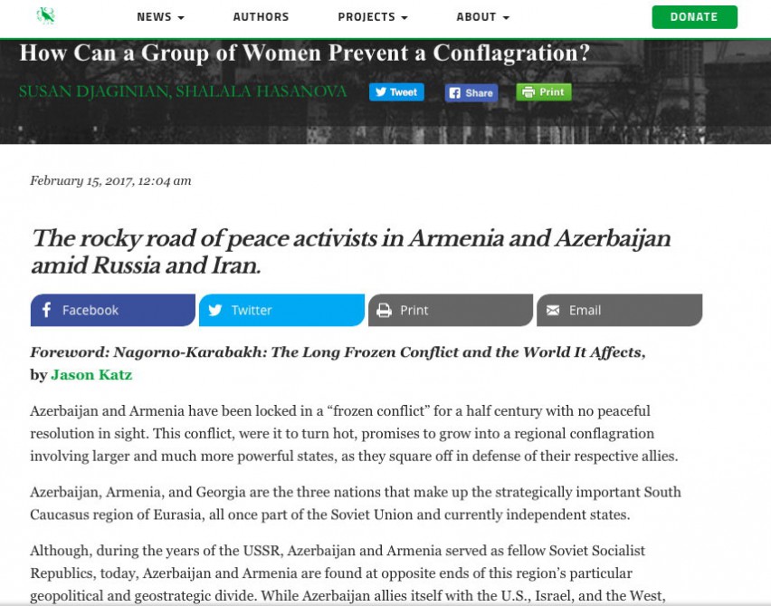 ABŞ-da çıxan “Amerikan Spektator” nəşri ermənilərin “Meridian” qeyri-hökumət təşkilatı sədrinin müavini Süzanna Caginyan ilə “İctimaiyyətlə əlaqələrin inkişafına dəstək” İctimai Birliyinin sədri Şəlalə Həsənovanın “Bir qrup qadın müharibənin qarşısını necə ala bilər?” sərlövhəli məqaləsini dərc edib.